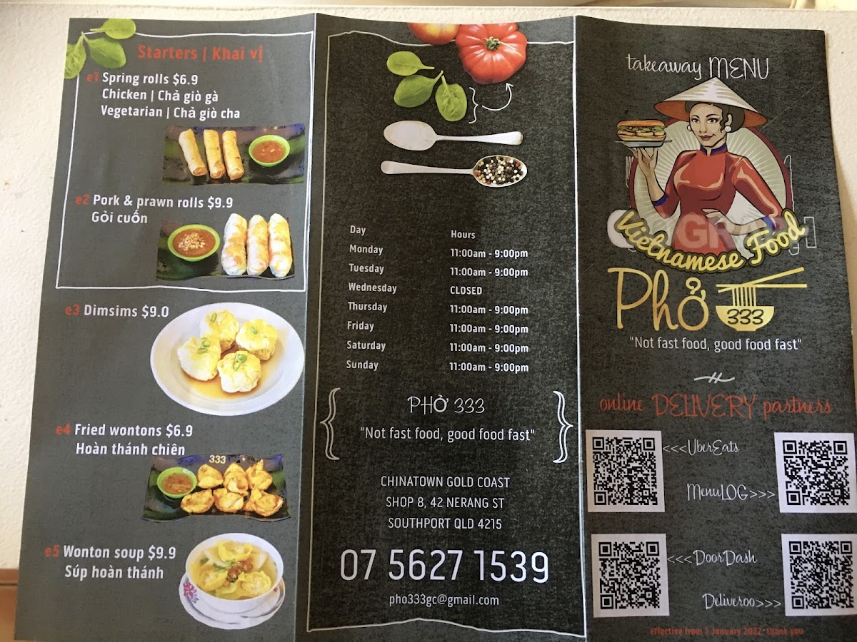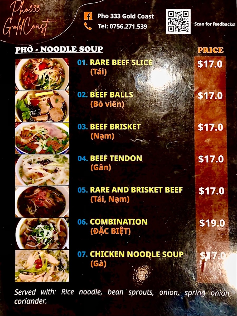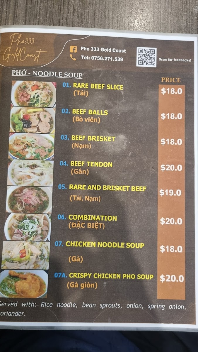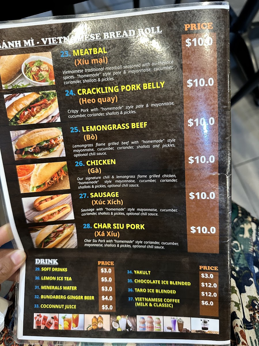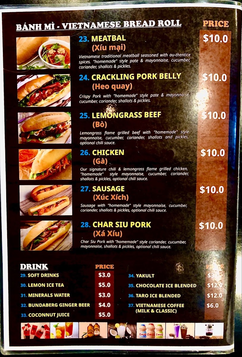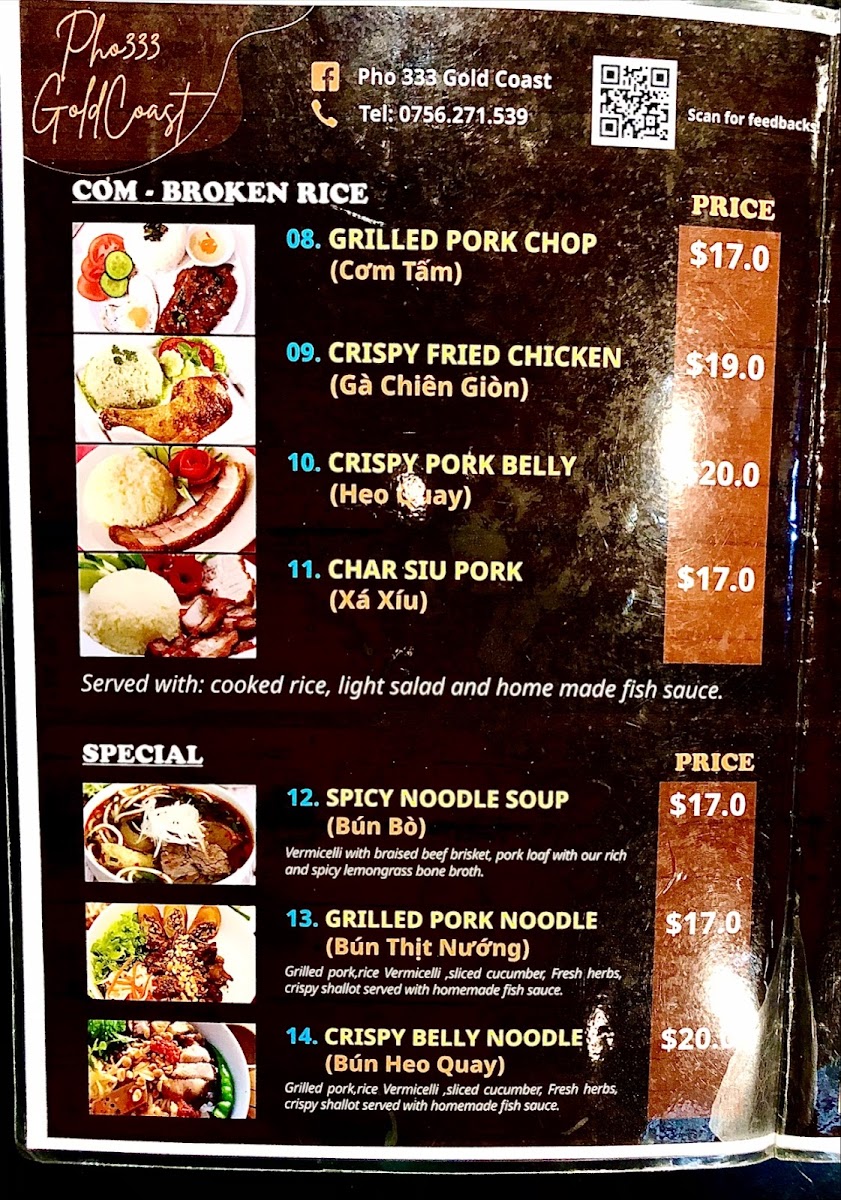 Pho 333 Gold Coast offers a diverse menu full of authentic Vietnamese flavors, featuring a wide range of dishes suited to all tastes. For a satisfying start, their Vietnamese Bread selection includes options like Chicken Bread and Beef Bread, priced reasonably, alongside other favorites such as Roasted Pork Belly Bread and Xa Xiu Bread. If you're in the mood for something more substantial, you can choose from their Specials, like Grilled Pork And Rice Vermicelli or Crispy Chicken Rice. The Vietnamese Pho Noodle Soup menu is a highlight, with dishes like Pho Rare Beef Noodle Soup and the indulgent Special - Crispy Pork Belly Rice. For those craving a delicious dessert, the Spring Rolls and Crispy Calamari are tempting options. Drinks include refreshing beverages like Bundaberg Ginger Beer, Lemon Ice Tea, and traditional Vietnamese Coffee. Whether you're craving something light or looking for a hearty meal, Pho 333 Gold Coast offers a satisfying and authentic Vietnamese dining experience.